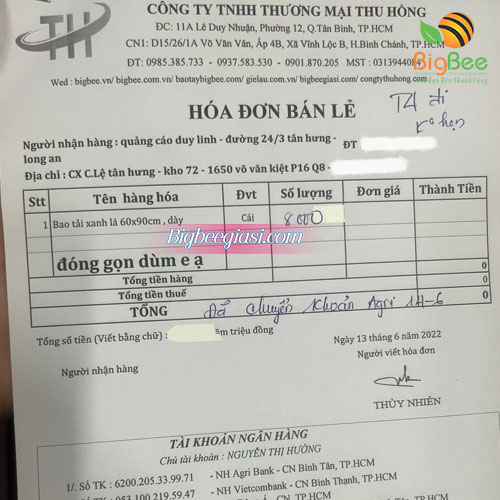 Hình ảnh hóa đơn bán lẻ đơn hàng 8000 bao tải