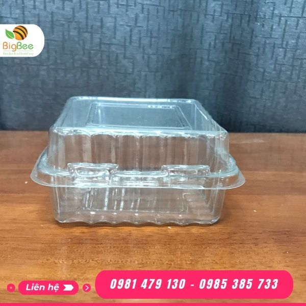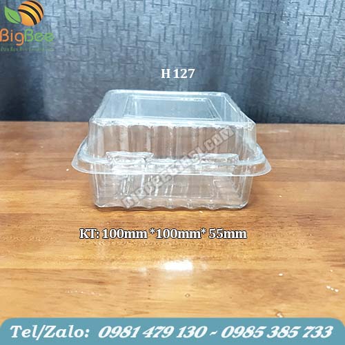 - Hộp nhựa trong H127 vuông được làm từ 100% nhựa PET nguyên sinh, an toàn, trong suốt, nhẹ, bền, dẻo dai, giúp chiếc bánh được trưng bày một cách tinh tế, thu hút ánh nhìn và làm nổi bật màu sắc và chất lượng sản phâm bên trong.