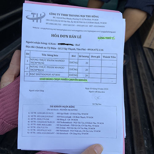 Công Ty TNHH TM Thu Hồng Giao sỉ 40 thùng màng bọc thực phẩm + 20 thùng giấy bạc nướng mango ra chành xe Tý Diệu – Số 2 Tây Thạnh, Tân Phú. Sản phẩm được giao đi cho anh Nam ở Tp. Thừa Thiên Huế.