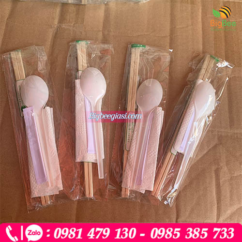 Ngoài ra (Muỗng, đũa, khăn, tăm) được đóng trong túi OPP chống thấm, giúp tăng độ vệ sinh an toàn thực phẩm và tiện dụng khi mang đi.