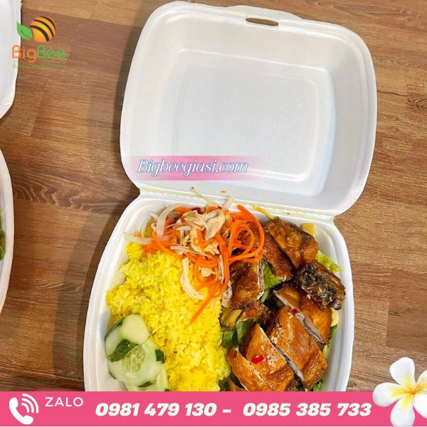 Hộp xốp đựng cơm có thể đựng được thức ăn nóng vừa phải, cách nhiệt với tay cầm và giữ được nhiệt độ. Hình dạng của hộp thường có dạng hình vuông và có thể in mực lên để trang trí hay nhận diện thương hiệu. Sản phẩm được dùng để làm hộp đựng cơm phần, đựng nguyên liệu, thức ăn, thực phẩm tiện lợi.