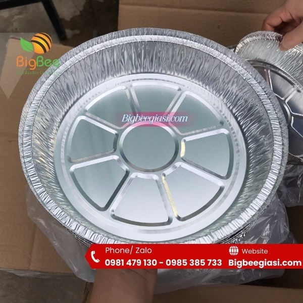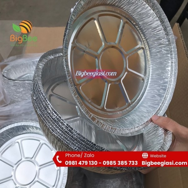 - Khay nhôm tròn dùng để giữ nóng bún, miến, chảo phở hoặc dùng để nướng thức ăn trong lò nướng, bếp nướng hay bảo quản thức ăn trong tủ lạnh. Dùng thay khay đựng trong các bữa tiệc BBQ, picnic hoặc đóng gói thức ăn.