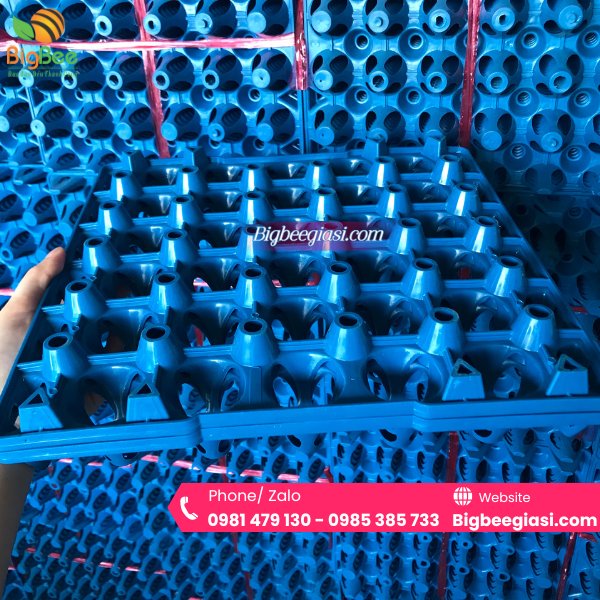 Thiết kế của khay nhựa là hình chữ nhật kích thước: 29,5*29,5*5,5cm, trọng lượng mỗi khay 1,8 - 2,2gr. Trên mỗi khay có 30 lỗ đựng được 30 quả trứng gà, vịt, ngan…Cả 2 mặt của khay đều đựng được trứng nên có thể xếp chồng lên nhau mà không làm vỡ trứng, giúp tiết kiệm không gian, dễ dàng vận chuyển đi xa, an toàn.