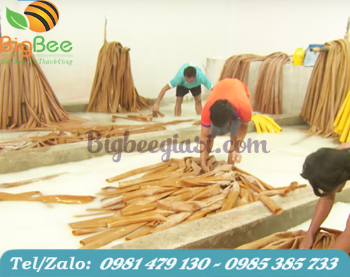 + Mua cao su lá (cao su crếpe) loại tốt, đem về cán bằng máy trục cho thành tờ cao su mỏng đều. Trong khi cán cao su lá thì trộn lưu hoàng vào. Tỉ lệ 100 kg cao su crêpe thì cho 2 kg bột lưu hoàng. Đồng thời trộn một ít phẩm màu đỏ, xanh, tím, vàng v.v… để nhuộm cao su.